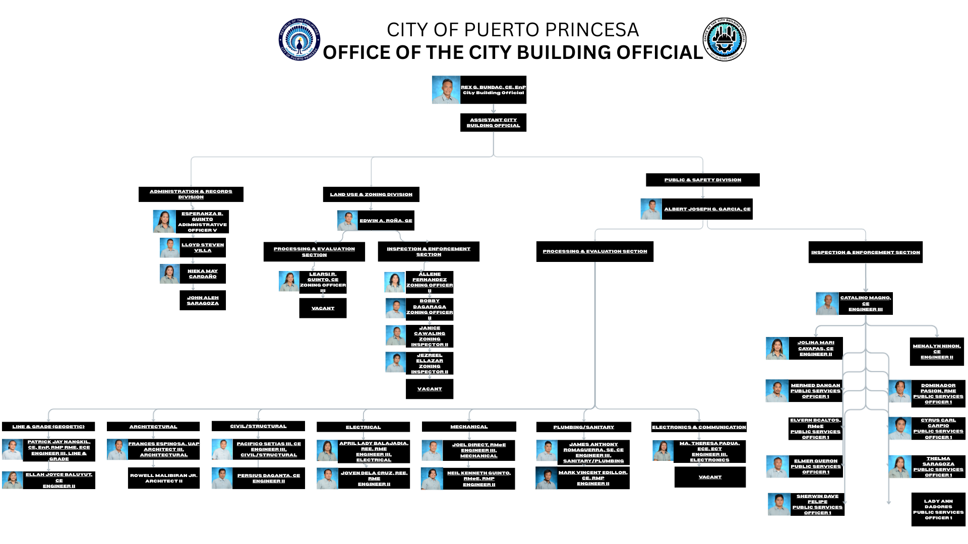 The Office of the City Building Official was created as a separate and distinct office from the Office of the City Engineer on January 1, 2018 by virtue of City Ordinance No. 856 by merging the Zoning Division of the Office the City Planning and Development Coordinator and the Building and Public Safety Section of the Office of the City Engineer. Engr. Rex G. Bundac, was designated as the City Building Official of the City Government of Puerto Princesa who is primarily responsible for the strict implementation and enforcement of the provisions of the National Building Code of the Philippines, as well as its Implementing Rules and Regulations (IRR), Zoning Ordinance and other related laws, ordinances and issuances.